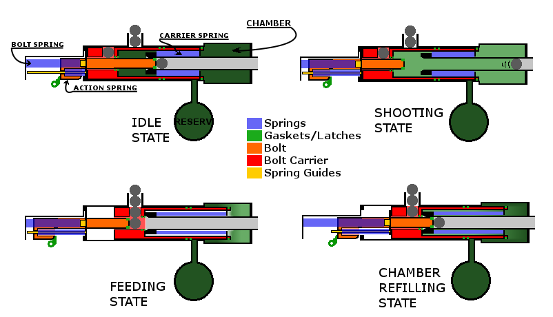 Lastly, the blue bars behind the Main Piston and Bolt are Springs. They simply push forward. Their combined force should be larger than the force exerted by the chamber pressure. The Bolt's Spring should be too strong as to stop a person from manually cycling it if needed.