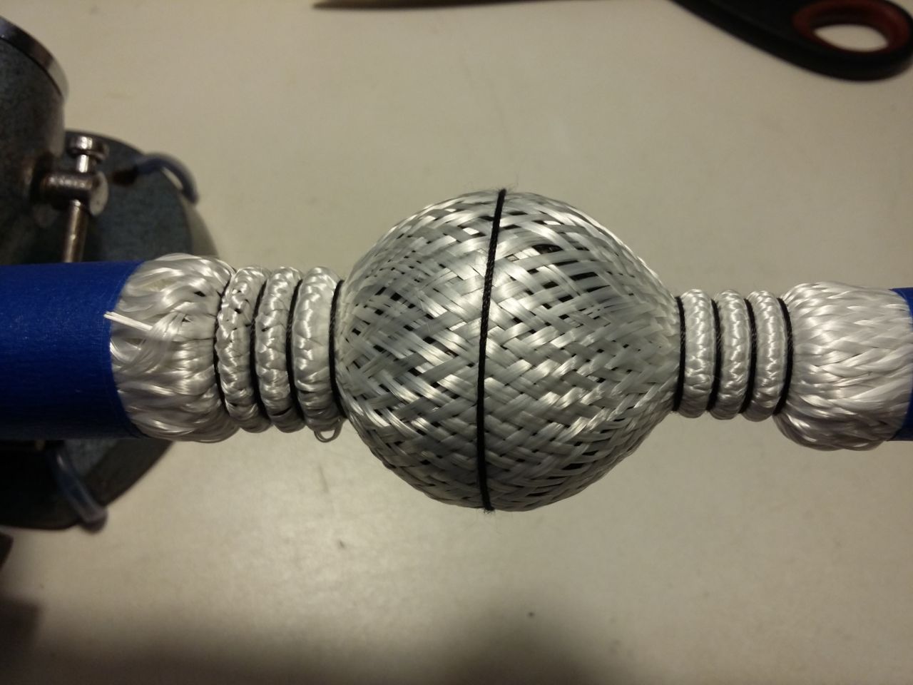 When it's done hardening, I'll also have to trim the excess fiber material from the ends. I prepared for this by added some painters tape to the steel tubes before adding the first layer of fiber, so when carefully cutting the fiber with my Proxxon rotary grinder/cutter I should be able to stop cutting when seeing the painters tape and avoid cutting into the tubing. If not, I'll need some more layers of tape for the next casting