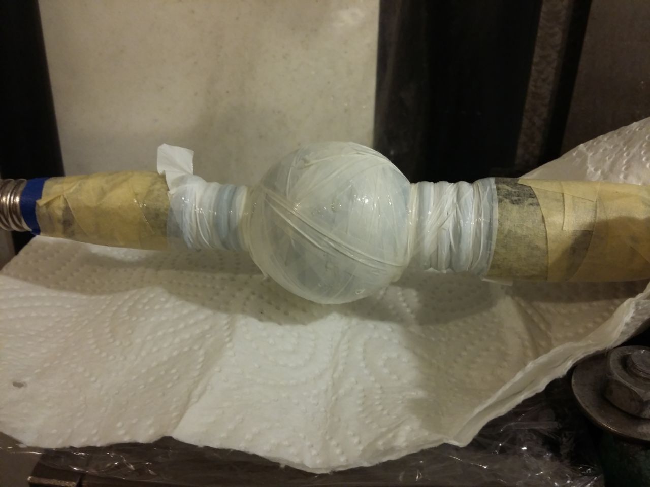 The idea is to make 2 half spheres the same diameter as the current 3D printed initiator chamber and silver solder them together and silver solder them to the corrugated steel tubes as well.