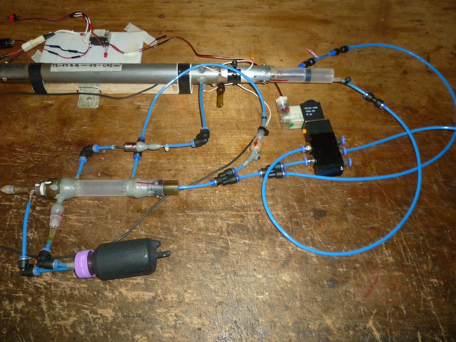 In the video you can see how this design works. I insert 6 mm ammunition of air soft to simulate in part, the restriction that will normally have the combustion chamber, and force the valve piston with depressurization to open fully.