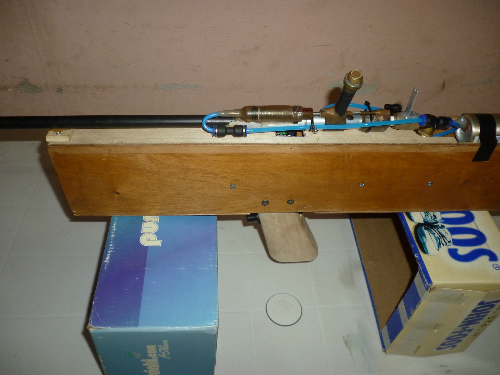 I managed to manufacture a small semi-automatic hybrid airsoft gun, I leave some pictures and next week I will make the corresponding video. Shoot 6mm plastic BBs, with enough speed at 5X. I have built some components again to make them smaller and put everything together in "something" with a sight and with a stock to be able to shoot. The compressed air tank the remote. It works perfectly, and shoots every 3 or 4 seconds.