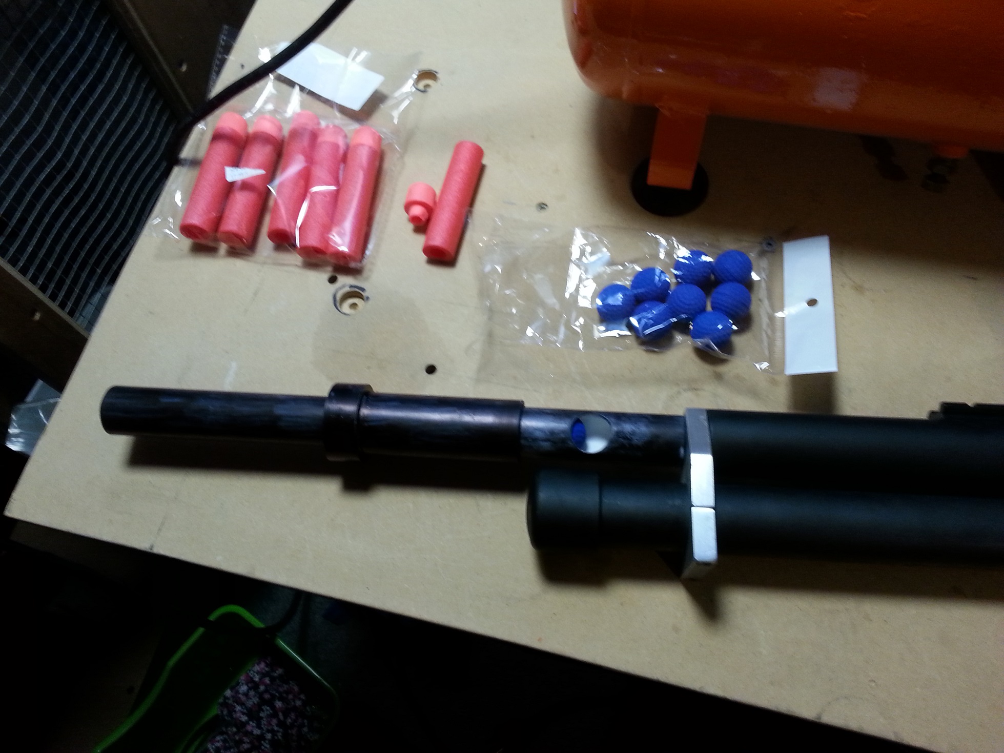 I have made an attachment for my airsoft launchers with 10mm OD barrels, it just has a sliding section and a hole to insert the foam ball. It is 3/4" Sch40 PVC, 20mm ID. The balls are Nerf Rival and are 23mm OD, so a nice airtight fit. I fired a couple at 80psi and even with all the dead space it was pretty impressive, the nerf dart not so much, it blew the foam head off as it left the barrel