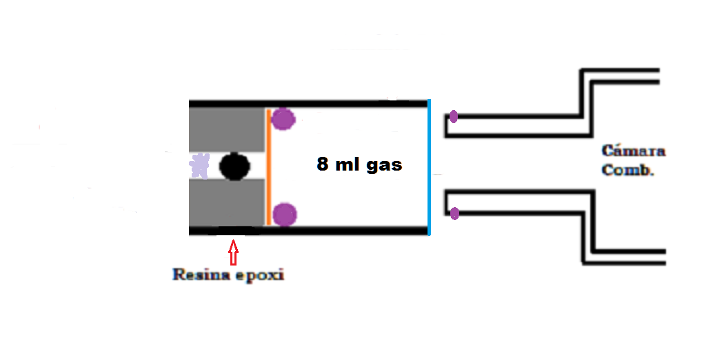 To try it, it is necessary to use absolutely no machined parts. What I plan to do is a slightly longer cartridge to house the 8 ml of gas, a piece of 5/8 "tubing and the rest is the same as what I have already manufactured and tested. Mylar tape, on the back of the cartridge, so that the gas does not spill When it enters the gun and moves the bolt, it breaks and the gas enters the combustion chamber, and is mixed by the speed of the air that generates a turbulence.
