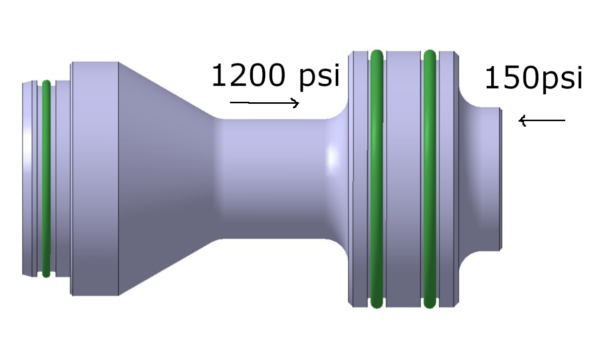 I removed the reduced diameter section at the rear (right on image) of the piston to increase the contact area with the bumper (2020mm2), whilst also increasing the spacing of the 2 o-rings