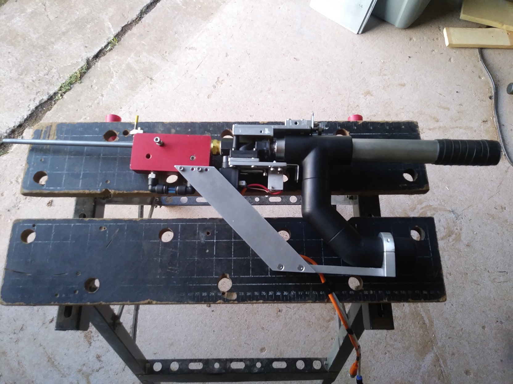 Got the semi auto together enough to test fire, it seems to work, no magazine tube yet. The chamber and 1/2" valve are from my old 10mm ball bearing launcher so the air supply is probably over kill. The piston is from an old pneumatic cylinder that is cut down. The red block is aluminium.