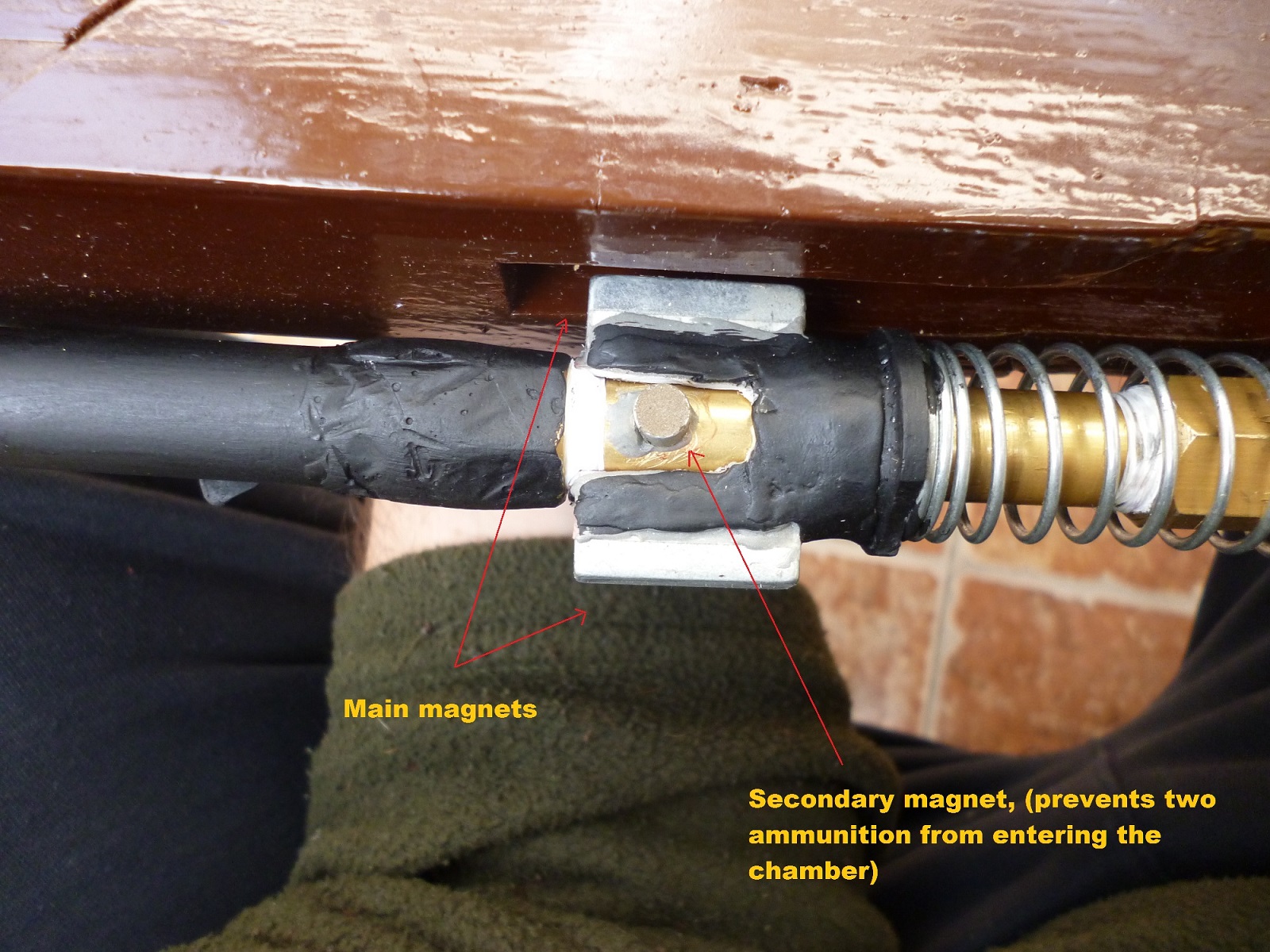The secondary magnet, the small one, is in charge of only one bb entering the chamber, because by anchoring it to the wall of the combustion chamber, it does not give rise to another occupying that same place. Batteries and solenoids are no longer required. The central body exerts enough force to press the bb a little against the retention oring.