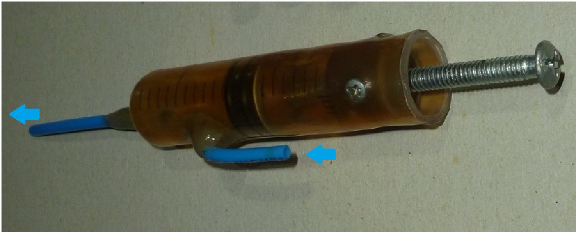 The air reservoir is a co2 tube, with an internal capacity of 500 cm3, which is filled to a pressure of 800-900 psi. After that, the lower safety valve opens loudly, (and I jump in fright)!