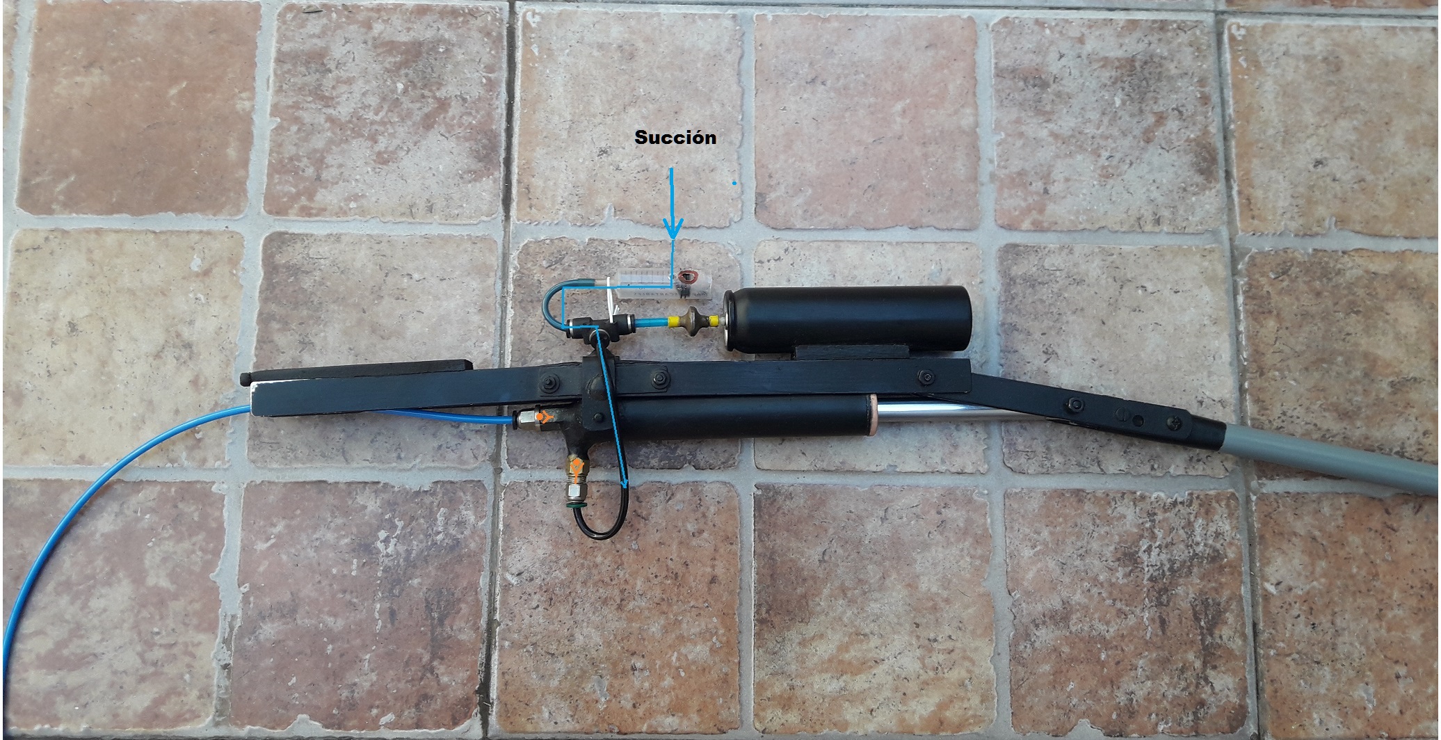 This is the simple system. You only press the valve of the commercial aerosol for one second, which is enough for the butane that enters to sweep all the air and the syringe that fills only with butane, (red line) and then you only use the pump to introduce the mixture into the weapon. The suction of the pump when it draws air introduces the gas inside the pump cylinder and then sends it mixed with the air inside the combustion chamber, it is infallible. The internal volume of the syringe is the dose, in this case 5.5 ml of butane. When the air is sucked in by the piston of the pump, it drags all the butane that was already in the syringe. Very practical. If you use a piece of hose used in pneumatics, for example with an internal diameter of 2.5 mm, you have 21 cm to be a cm3. You can calibrate with much more precision the volume of butane, increasing or decreasing the length, with infinite more precision than with a syringe. For someone to try to measure 0.01 cm3 less with a common syringe, it is impossible! With the hose I describe, you only cut 2.1mm and you're good to go. In addition, the air in the hose is displaced by the butane with much less butane waste, and you eliminate some randomness caused by turbulence in a dispenser with a syringe geometry.