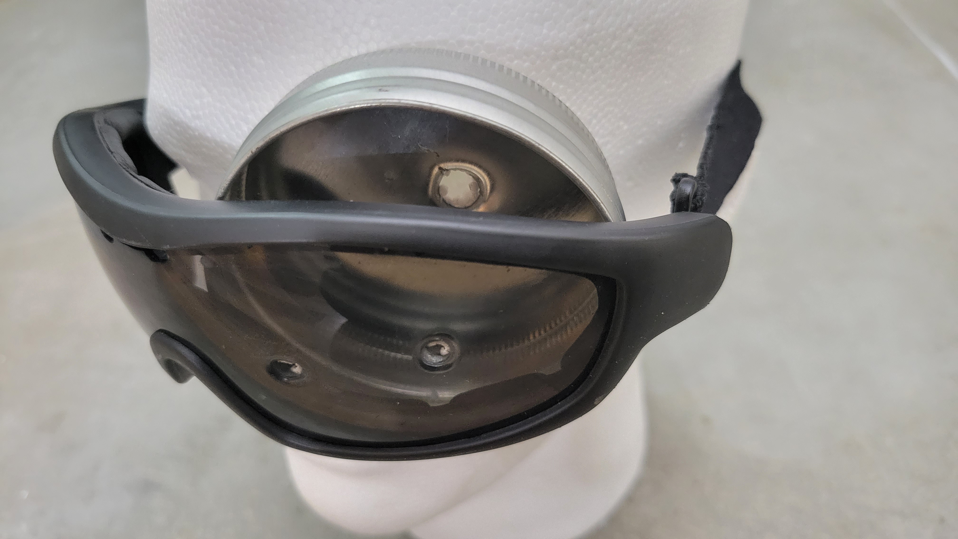 Biodegradable BBs are fragile but at these speeds the penetration is impressive, right through the goggles and the polystyrene head and into the backstop behind it. I added a pellet tin and it still blew through as if it wasn't there: