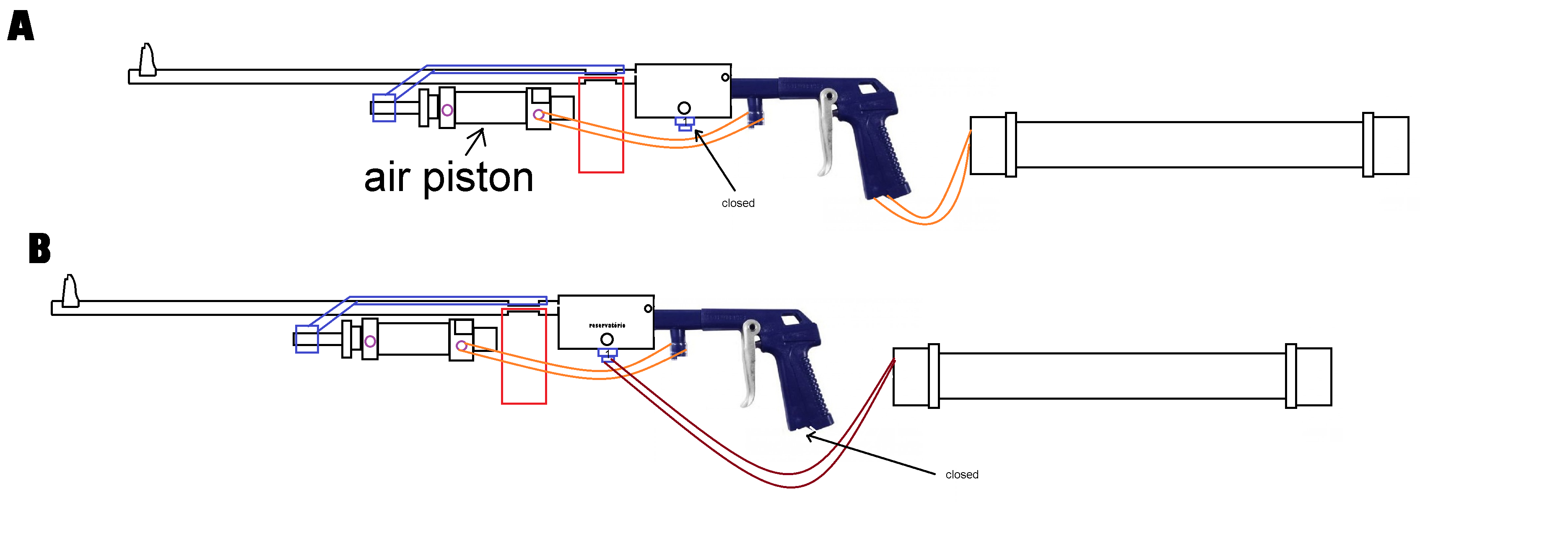 2- can I connect the reservoir directly into the blowgun handle like in example A by closing off the QEV air entry (marked as 1) and putting a shredder valve at the back of the reservoir to fill it up from there? Or would it need to be done like example B?
