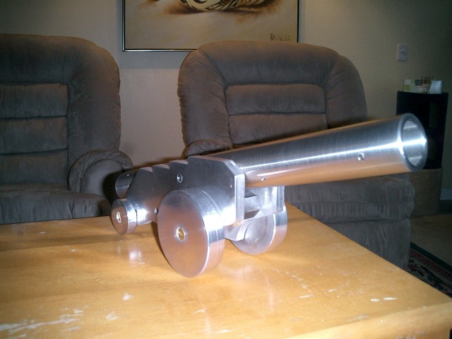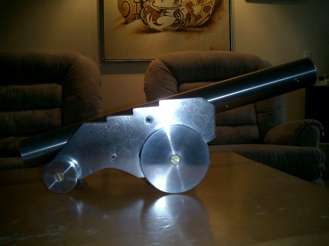 The barrel was actually 4 pieces that I mig welded together, then turned down on a lathe. The barrel is over 1/4" thick and about 14" long with a 1" bore down the center. (It's nice having machine tools in your shed) I used brass fasteners and hex weights on the bottom of the chassis to weight it down. It weights about 30 lbs!