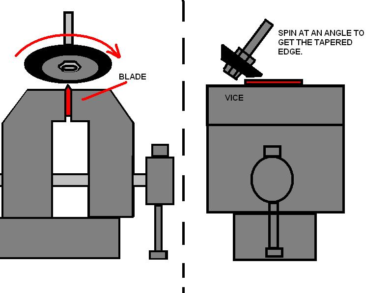 Spin the drill at maximum velocity and gentley ( sp?) start grinding the neoprene circle straight on top of the blade,pushing it onto the vice. BUT WITH THE DISC AT AN ANGLE!!
