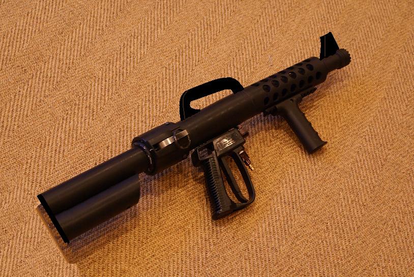 twitch- its hooked up to a 5lb CO2 tank, which is mounted in a backpack. It weighs between 20-25 lbs, but it really isn't bad at all because the backpack I use is fantastic. I'll have pictures of my entire rig up in a bit.