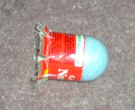 i dont know y i did this but i thought it would look cool. i found out on spudtech that a tones spice bottle fits a 1.5"sch40 pipe and so does a golfball with the shell removed, so id ecided to put the ball into the bottle and make a cool shell, and then i decided to make it like a shotgun shell and make it so u load it into a union and then fire and pull out the empty casing. tell me what u think, (future ones will have more presicion, i made this in about 4 seconds with a pocket knife.)