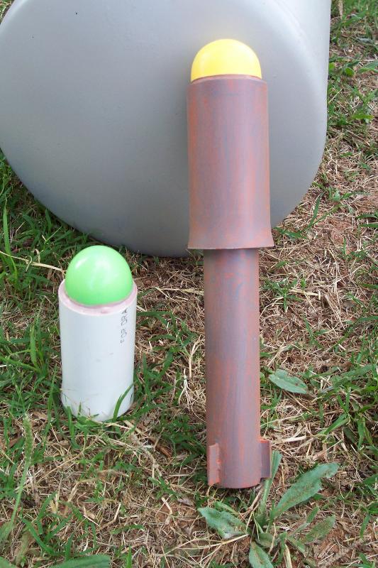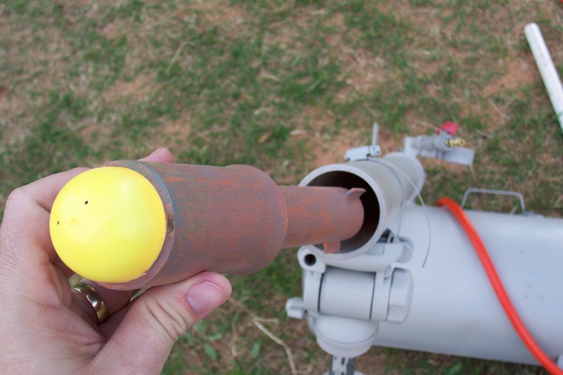 thx jimmy, the 50mm shell was well balanced to my surprise, i tried to watch it the entire flight and i never seen it tumble, it fish tailed like crazy going up and coming down. this one shot farther than my other shells due to the extra nose weight im sure. all together it has about 2 inches of bondo in the nose. im going to add about a 3 foot streamer tail for 2 reasons, 1. to get it to fly more steady and 2. to help locate the shell if it accidently goes into the tall grass. i lost one shell already. btw i have to shoot it almost straight up because it shoots so high in the air, firing it at this angle it still lands about 200 yards away with only 80 psi.