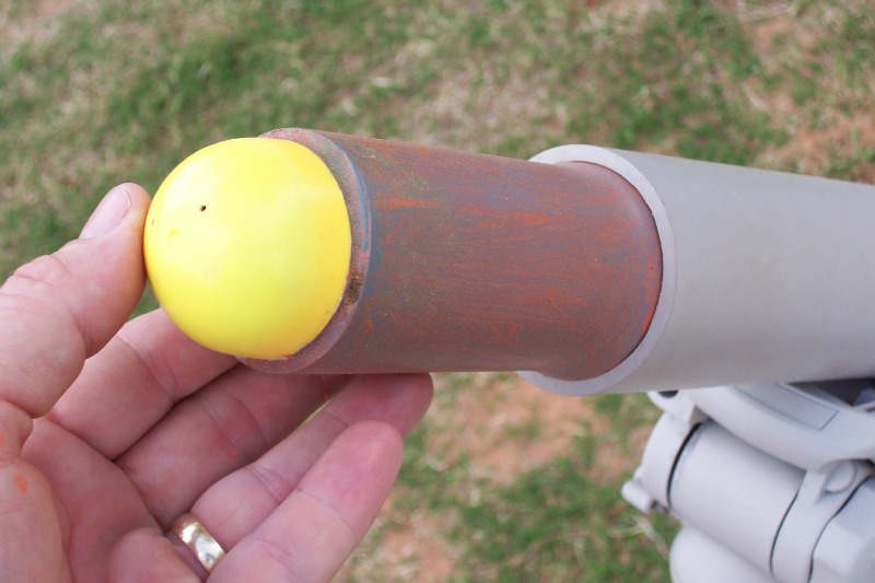 thx jimmy, the 50mm shell was well balanced to my surprise, i tried to watch it the entire flight and i never seen it tumble, it fish tailed like crazy going up and coming down. this one shot farther than my other shells due to the extra nose weight im sure. all together it has about 2 inches of bondo in the nose. im going to add about a 3 foot streamer tail for 2 reasons, 1. to get it to fly more steady and 2. to help locate the shell if it accidently goes into the tall grass. i lost one shell already. btw i have to shoot it almost straight up because it shoots so high in the air, firing it at this angle it still lands about 200 yards away with only 80 psi.