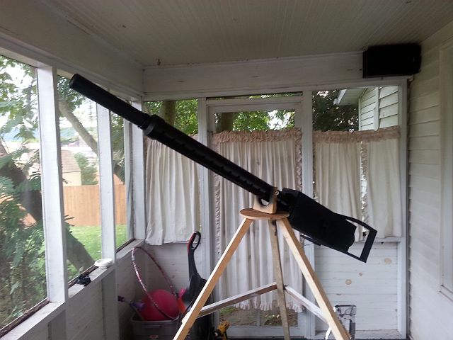 Our first gun we built. It was built from a 24" x 4" combustion chamber and a 50" barrel. It does pack quite a punch. We also mounted it on a lumber frame tripod. So far we have cleared about 300yds and punched through 3/4" osb sheeting at 50ft on a hairspray accelerant.