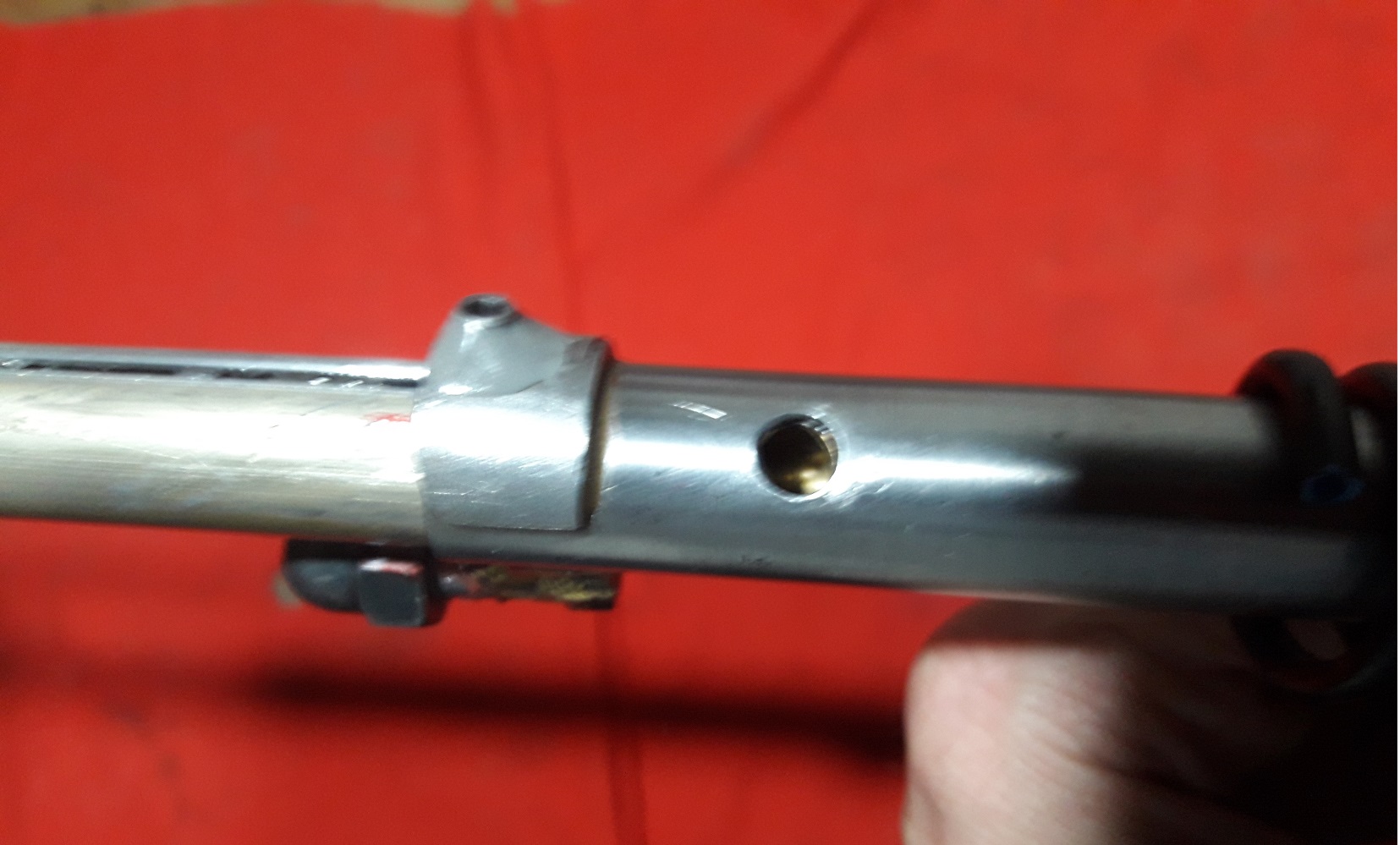 The compression tube is 16 mm, which results in it not being very hard to compress. It uses about 35 cm3 of air and 1.5 cm3 of butane that comes from a common lighter, which acts as a refillable fuel tank.